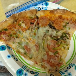 Most delicious crust / dough I've tasted, flakey & yummy. I just get a large cheese pizza, feeds our family of 4 for a couple meals because the pizza is so big. We get the slices double cut cause they're so big, AND their ranch is amazing Highly recommend